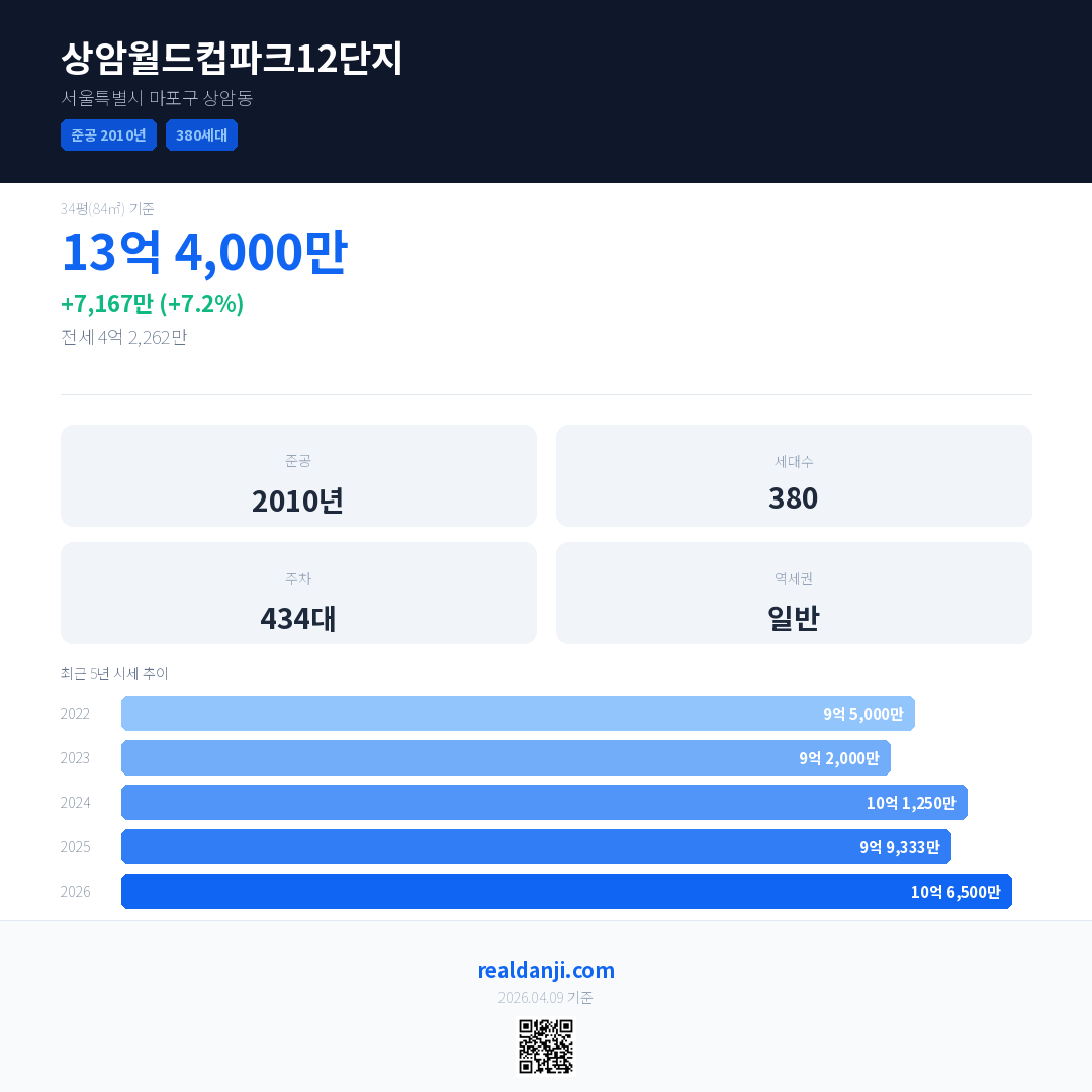 상암월드컵파크12단지 최근 거래가는 13억 4,000만입니다. (2026-03)