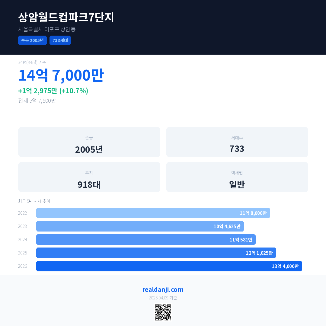 상암월드컵파크7단지 국민평형 기준 2026년 평균 거래가는 13억 4,000만으로, 전년 대비 10.7% 상승 했습니다.