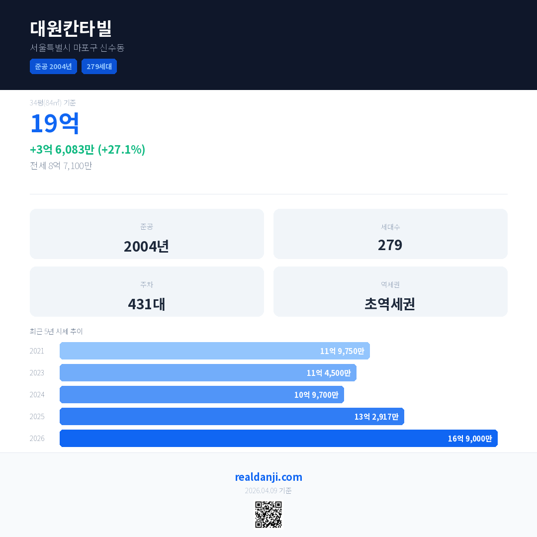 대원칸타빌 최근 거래가는 19억입니다. (2026-01)