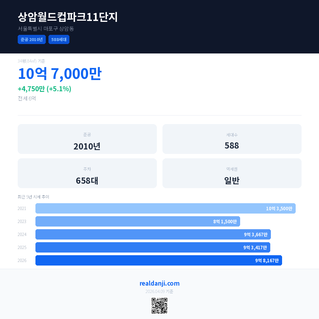 상암월드컵파크11단지 최근 거래가는 10억 7,000만입니다. (2026-02)