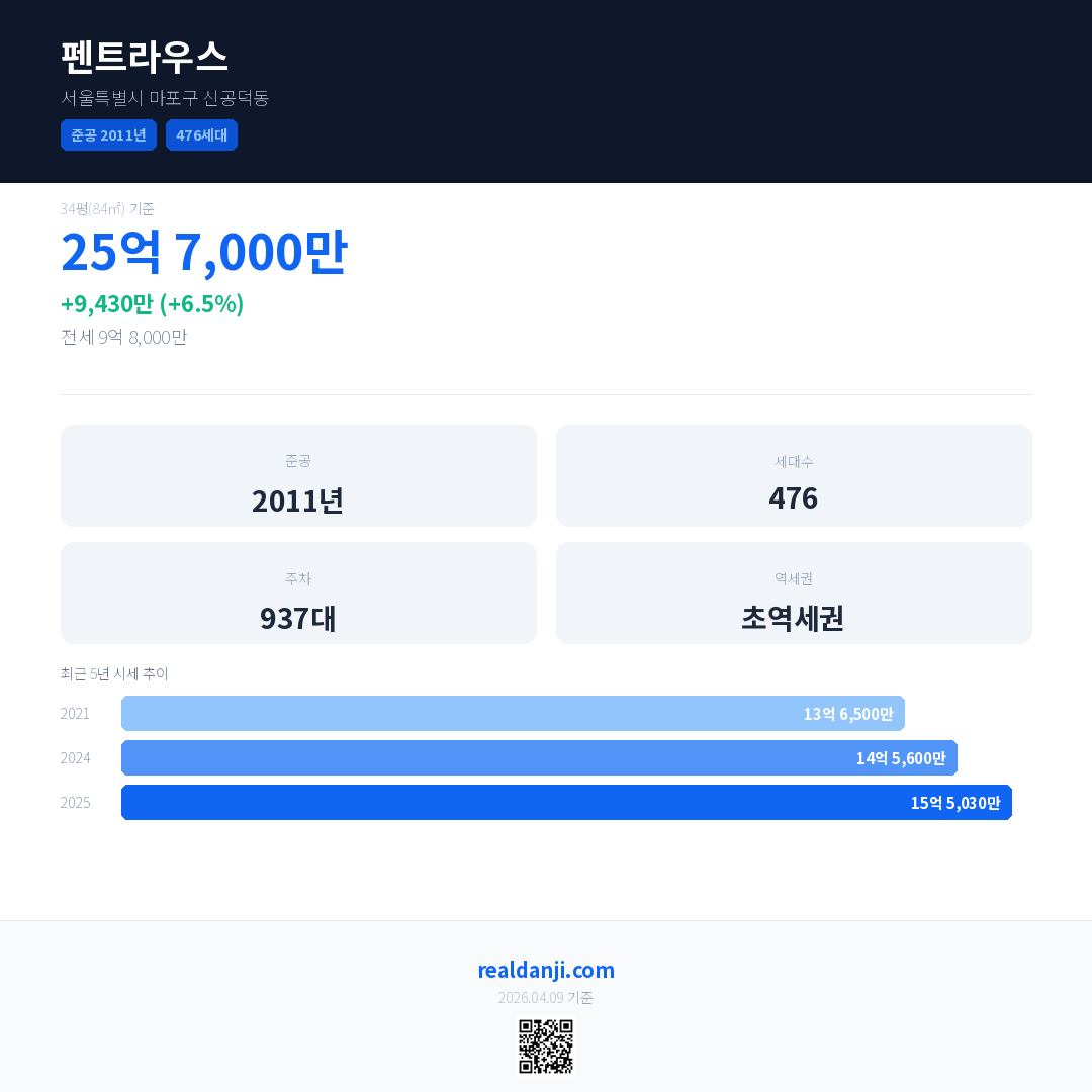 펜트라우스 국민평형 기준 2025년 평균 거래가는 15억 5,030만으로, 전년 대비 6.5% 상승 했습니다.