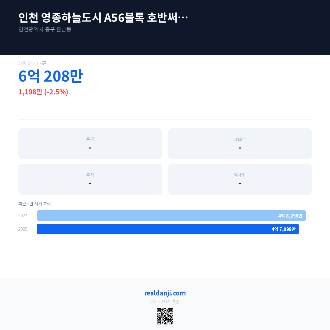 인천 영종하늘도시 A56블록 호반써밋 스카이센트럴Ⅱ 국민평형 기준 2025년 평균 거래가는 4억 7,098만으로, 전년 대비 2.5% 하락 했습니다.