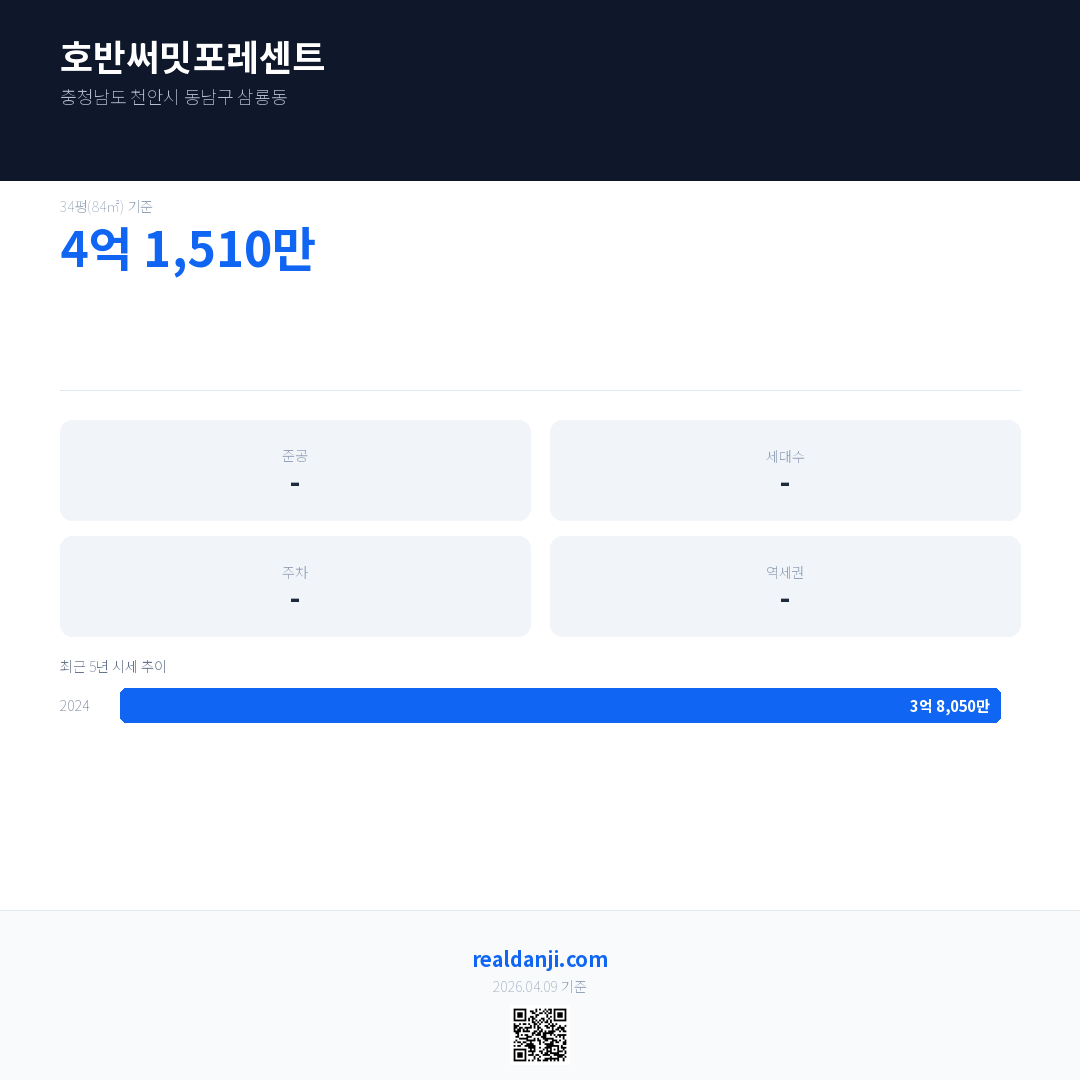 호반써밋포레센트 최근 거래가는 4억 1,510만입니다. (2024-05)