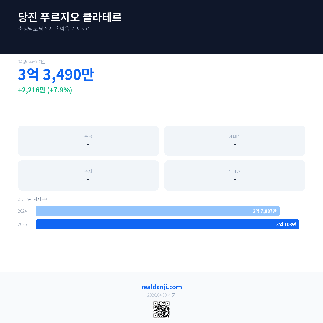 당진 푸르지오 클라테르 국민평형 기준 2025년 평균 거래가는 3억 103만으로, 전년 대비 7.9% 상승 했습니다.
