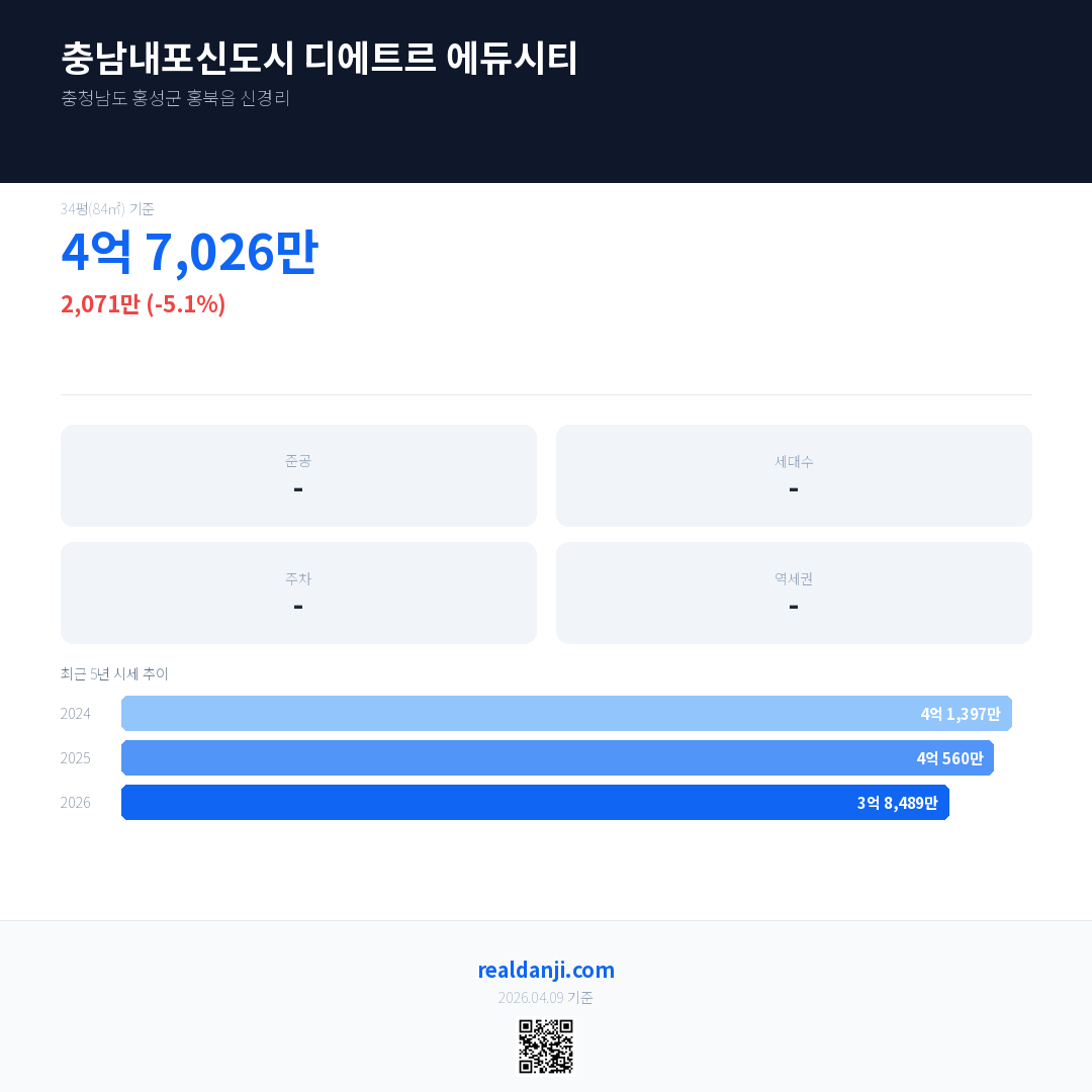 충남내포신도시 디에트르 에듀시티 국민평형 기준 2026년 평균 거래가는 3억 8,489만으로, 전년 대비 5.1% 하락 했습니다.