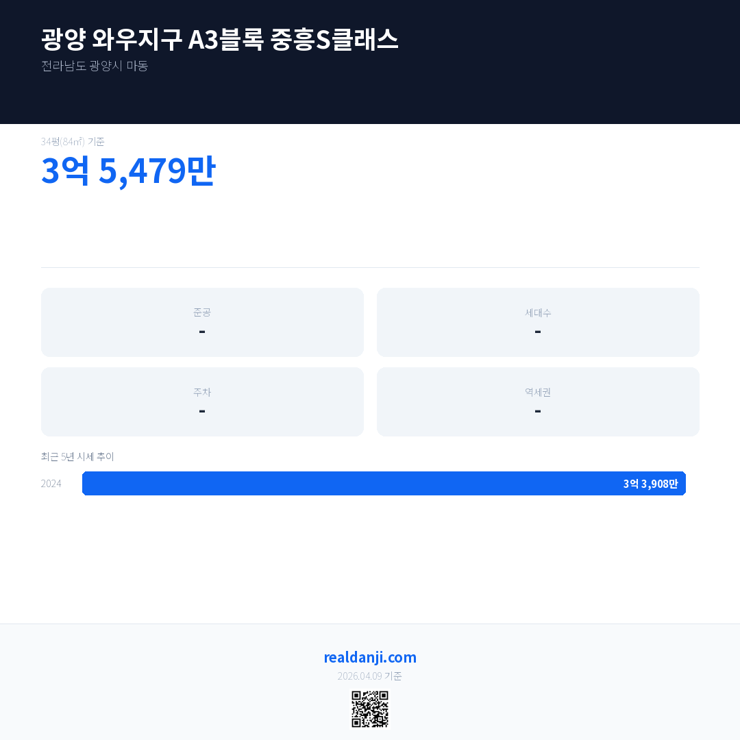 광양 와우지구 A3블록 중흥S클래스 최근 거래가는 3억 3,720만입니다. (2024-10)