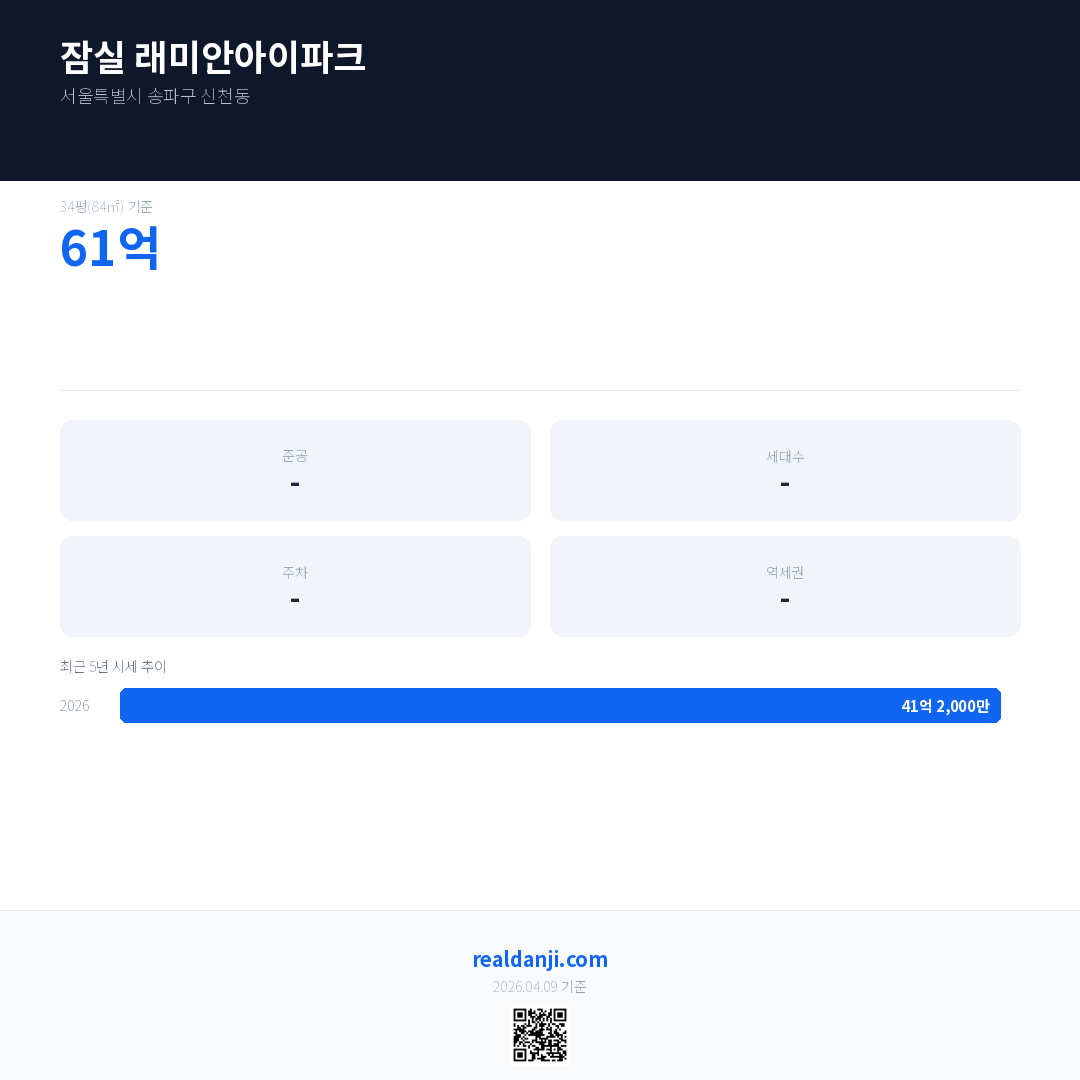 잠실 래미안아이파크 최근 거래가는 41억 2,000만입니다. (2026-03)