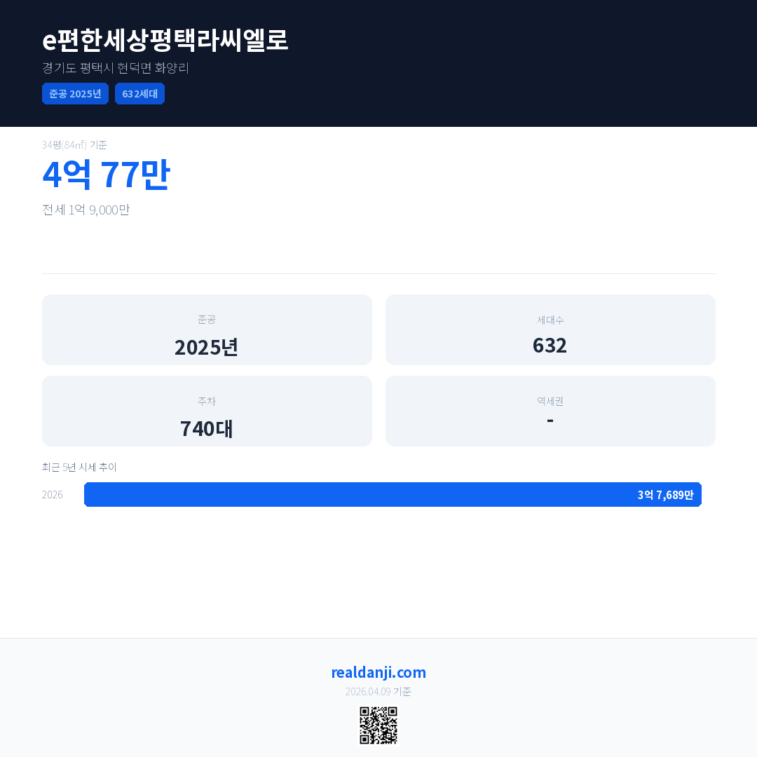 e편한세상평택라씨엘로 최근 거래가는 4억 77만입니다. (2026-04)