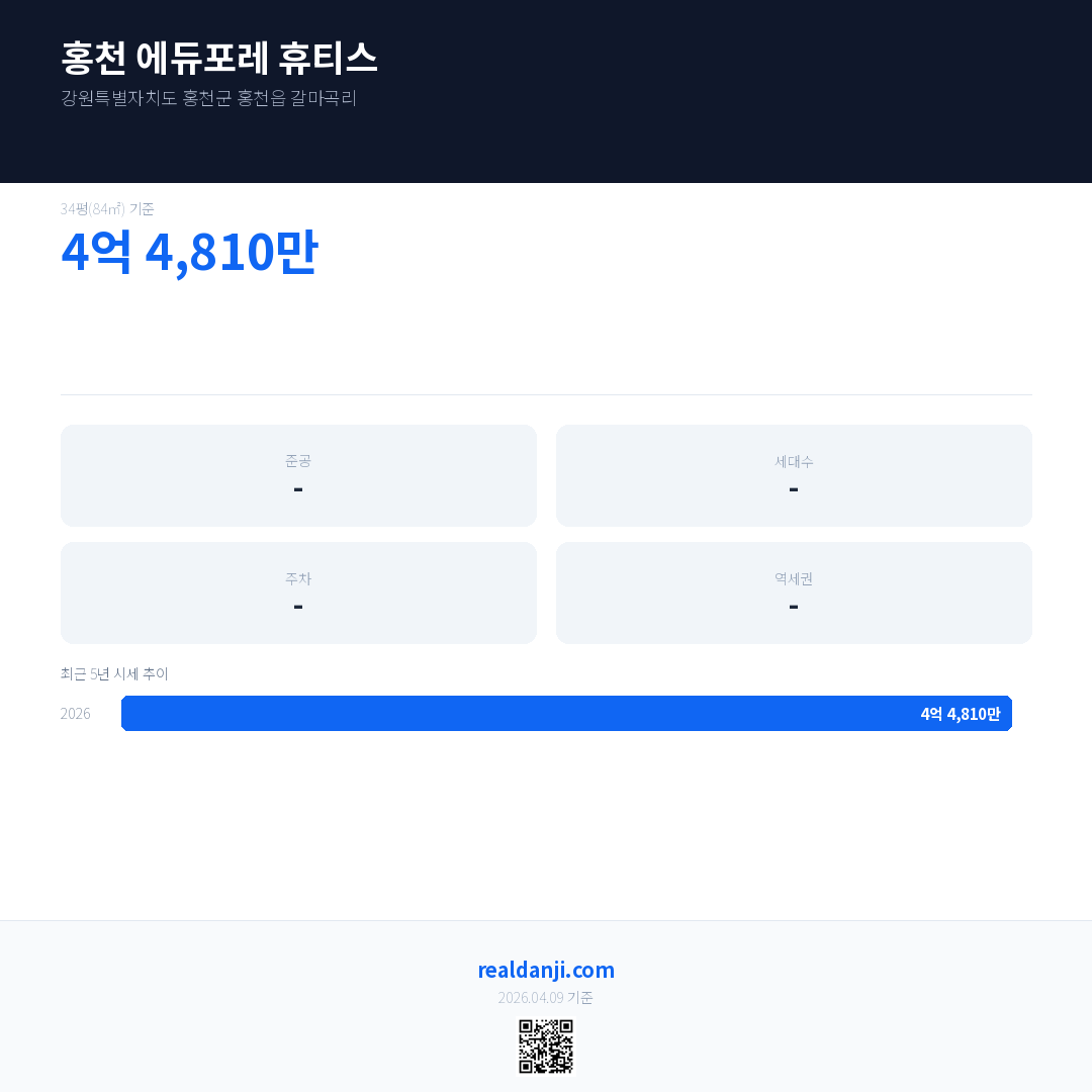 홍천 에듀포레 휴티스 최근 거래가는 4억 4,810만입니다. (2026-03)