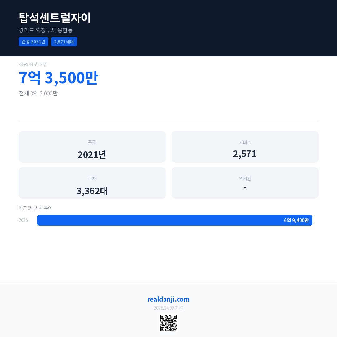 탑석센트럴자이은(는) 2021년에 준공되었으며, 현재 5년차입니다. 총 2,571세대 규모입니다.