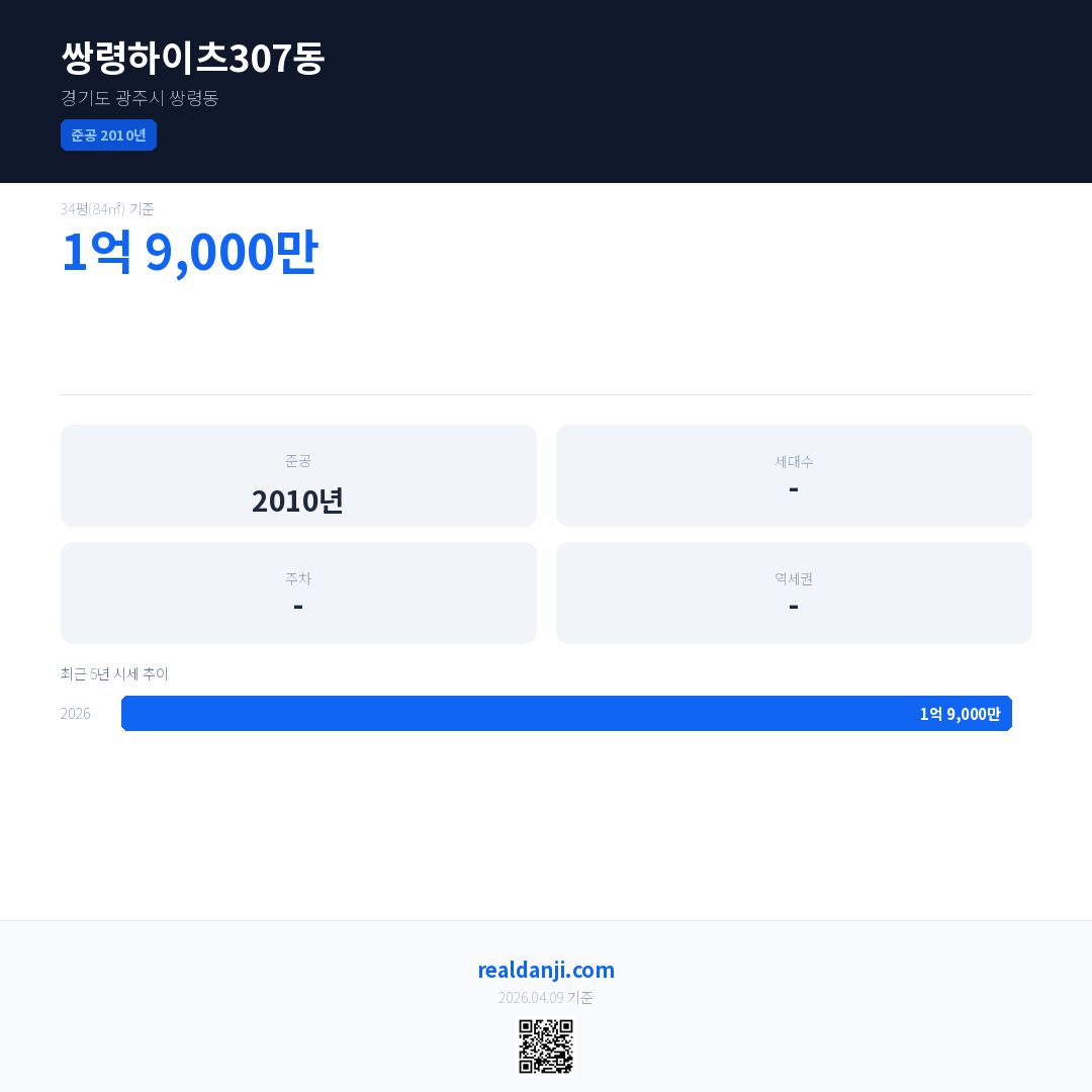 쌍령하이츠307동 최근 거래가는 1억 9,000만입니다.