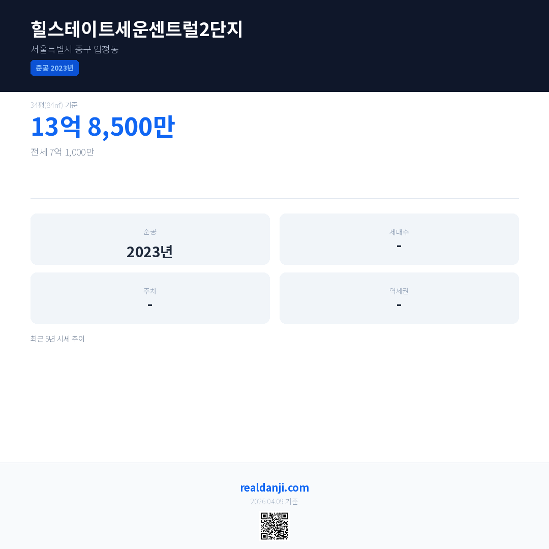 힐스테이트세운센트럴2단지 최근 거래가는 13억 8,500만입니다. (2026-03)