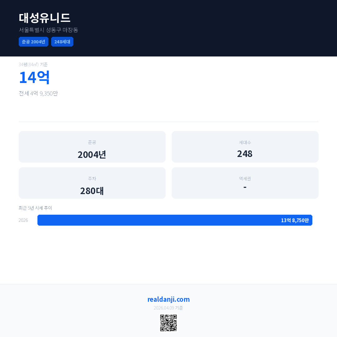 대성유니드은(는) 2004년에 준공되었으며, 현재 22년차입니다. 총 248세대 규모입니다.