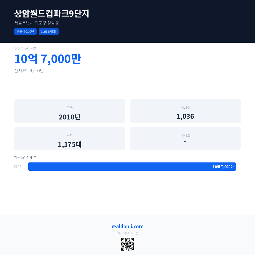 상암월드컵파크9단지 최근 거래가는 10억 7,000만입니다. (2026-03)