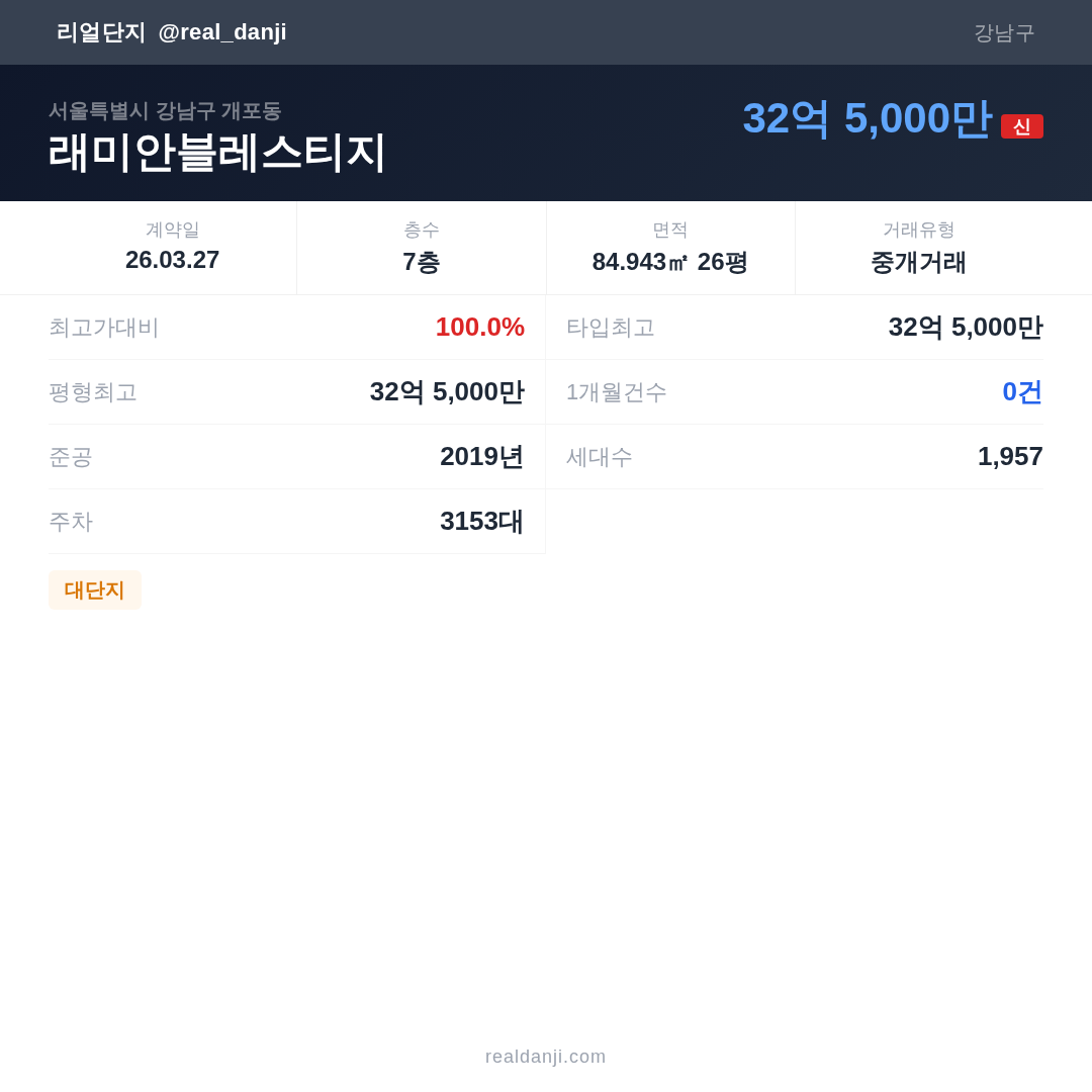| 2026.03.27 | 85㎡ | 7층 | 32억 5,000만 |