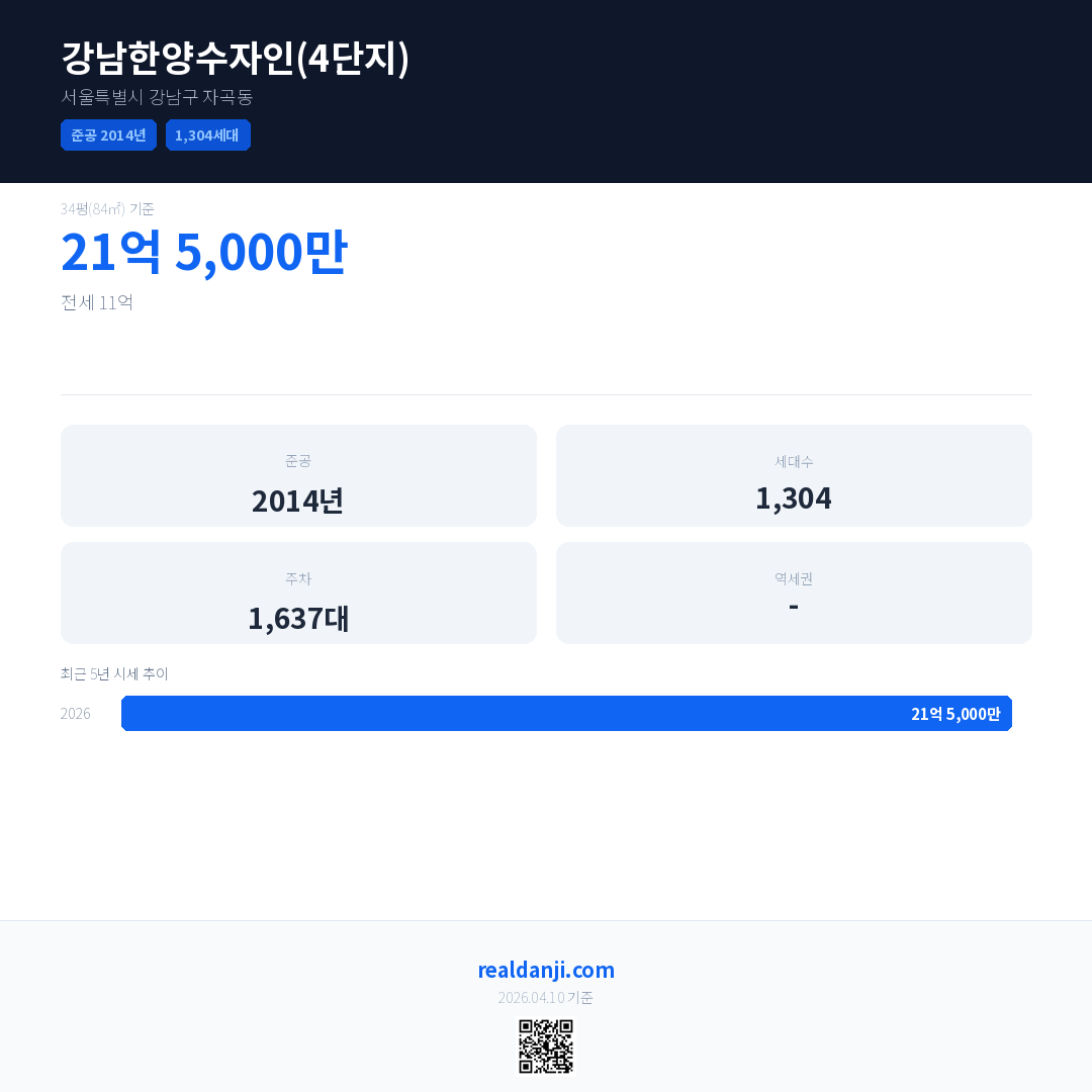 강남한양수자인(4단지) 최근 거래가는 21억 5,000만입니다. (2026-04)