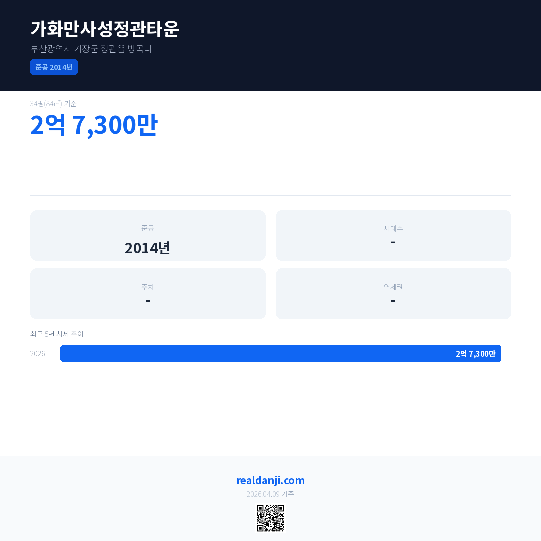 가화만사성정관타운 최근 거래가는 2억 7,300만입니다. (2026-03)