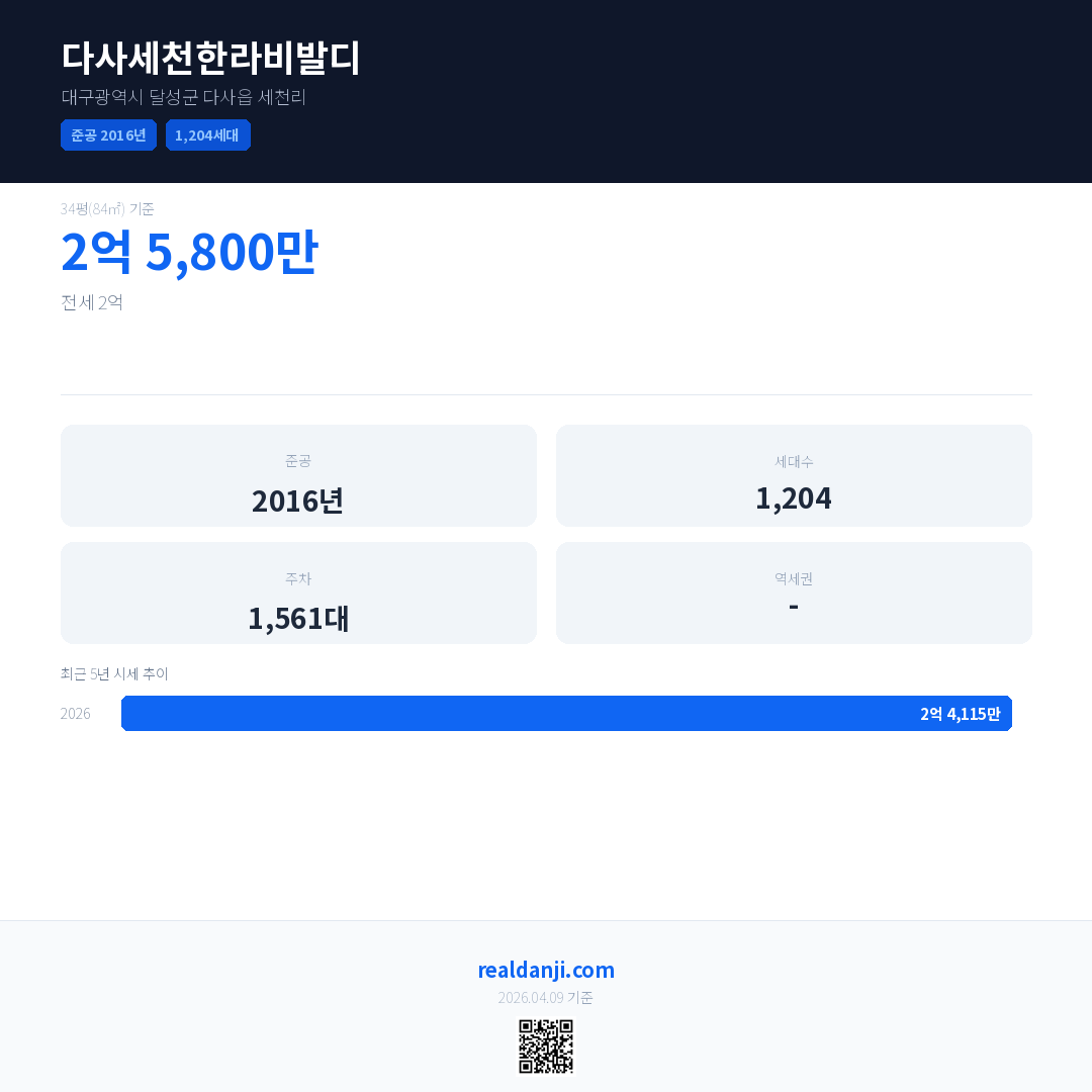 다사세천한라비발디은(는) 2016년에 준공되었으며, 현재 10년차입니다.
