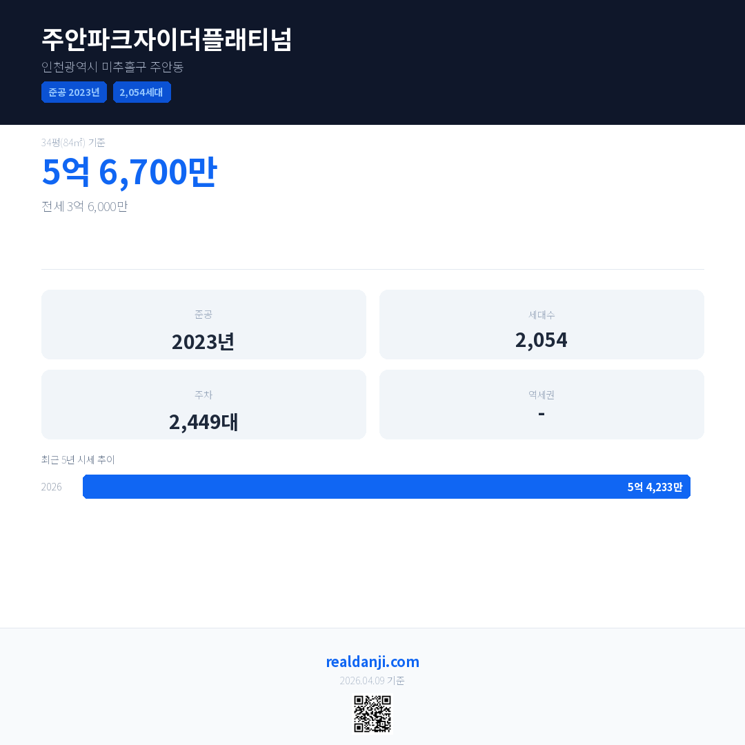 주안파크자이더플래티넘 최근 거래가는 5억 6,700만입니다. (2026-04)