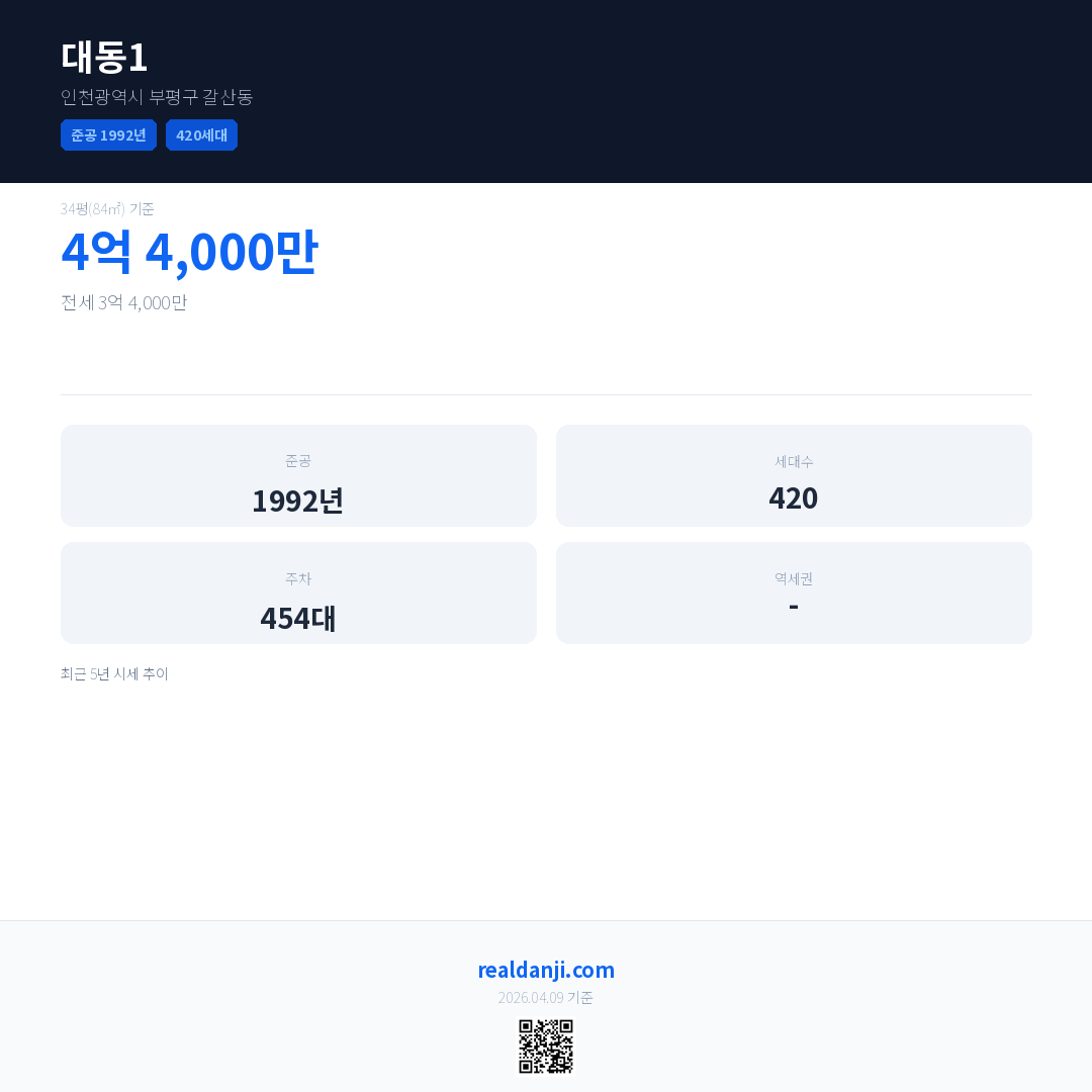 대동1은(는) 1992년에 준공되었으며, 현재 34년차입니다. 총 420세대 규모입니다.