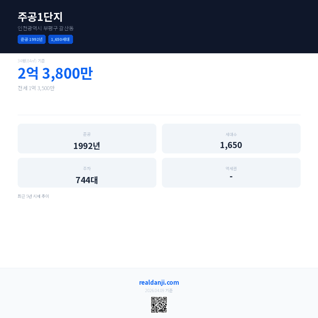 주공1단지은(는) 1992년에 준공되었으며, 현재 34년차입니다. 총 1,650세대 규모입니다.