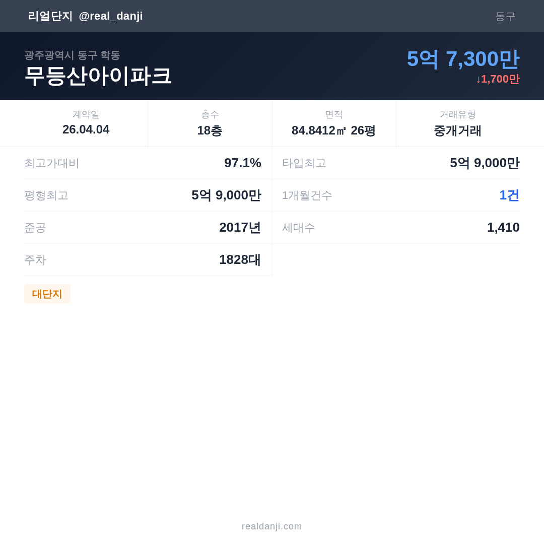 무등산아이파크 최근 거래가는 5억 9,000만입니다. (2026-04)