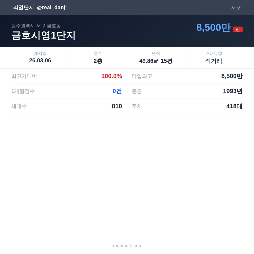 금호시영1단지 최근 거래가는 8,500만입니다. (2026-03)