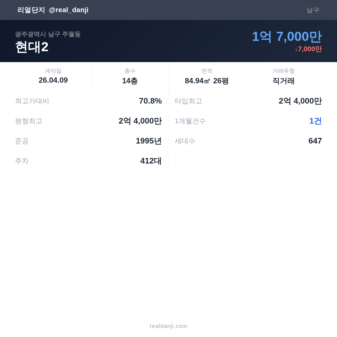 | 2026.04.09 | 85㎡ | 14층 | 1억 7,000만 |