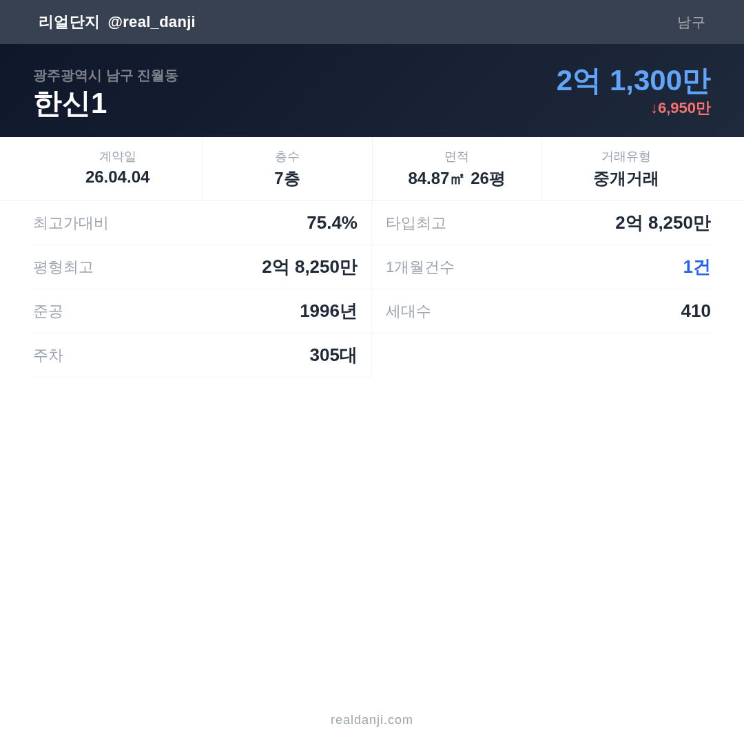 | 2026.04.04 | 85㎡ | 7층 | 2억 1,300만 |