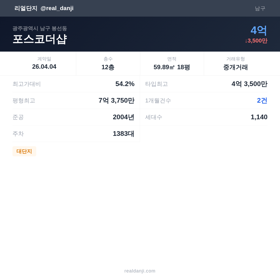 | 2026.04.04 | 60㎡ | 12층 | 4억 |