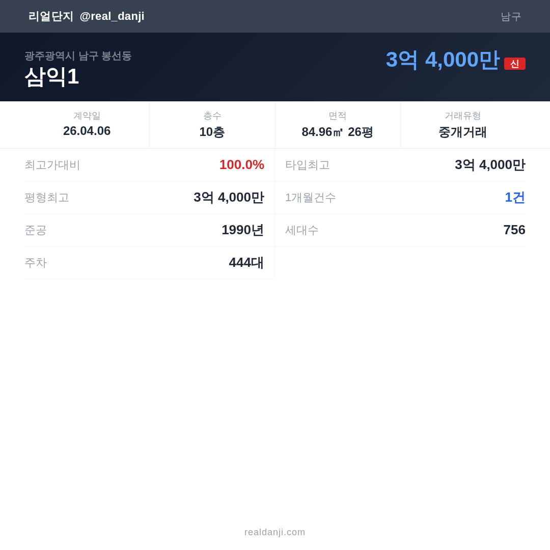 삼익1 최근 거래가는 3억 4,000만입니다. (2026-04)