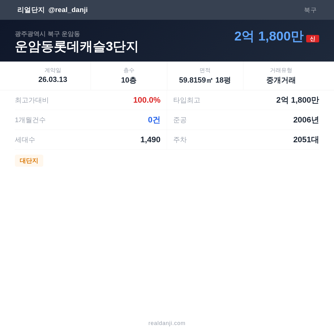 운암동롯데캐슬3단지 최근 거래가는 2억 1,800만입니다. (2026-03)