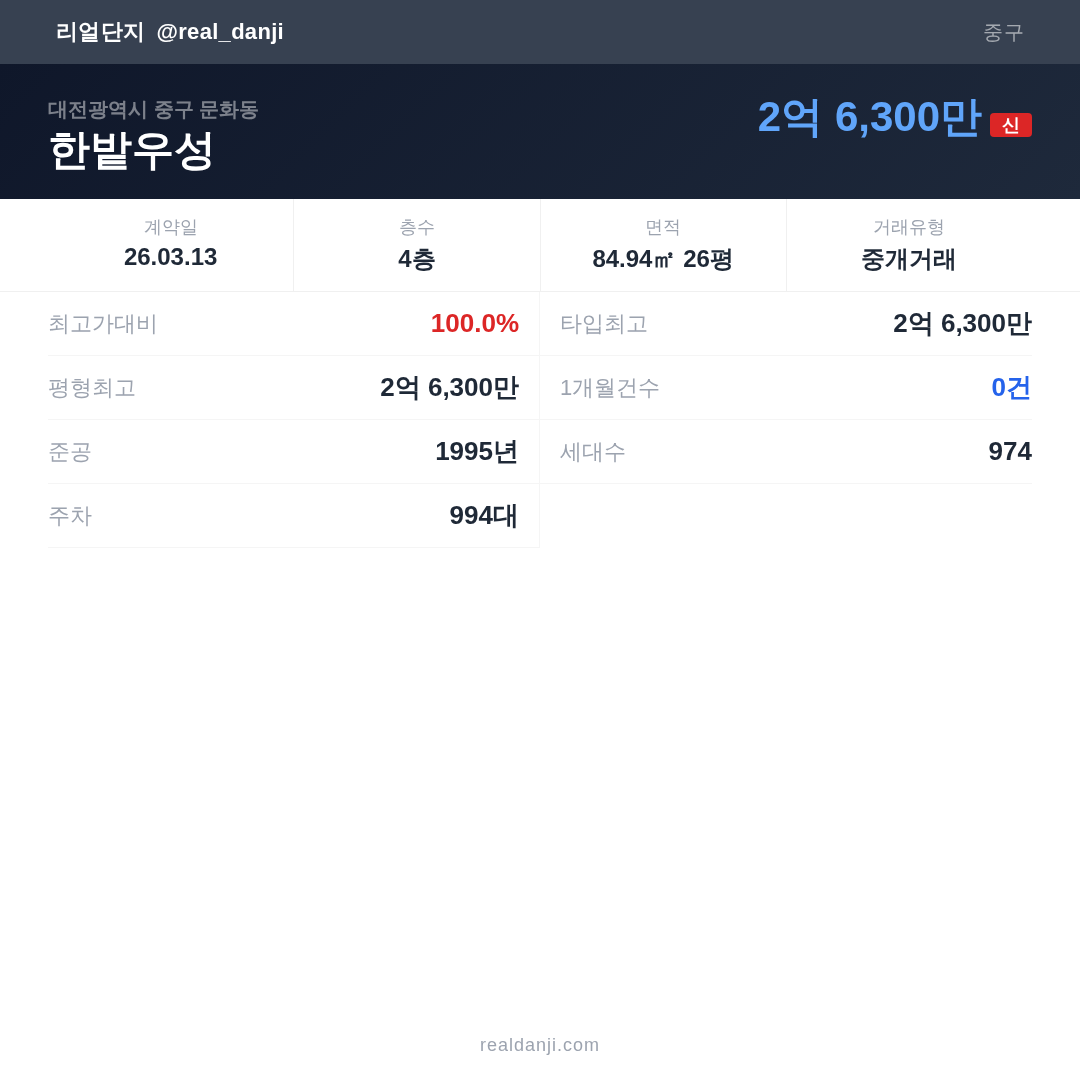 한밭우성 최근 거래가는 2억 6,300만입니다. (2026-03)