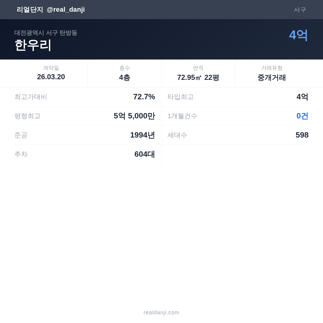 | 2026.03.20 | 73㎡ | 4층 | 4억 |