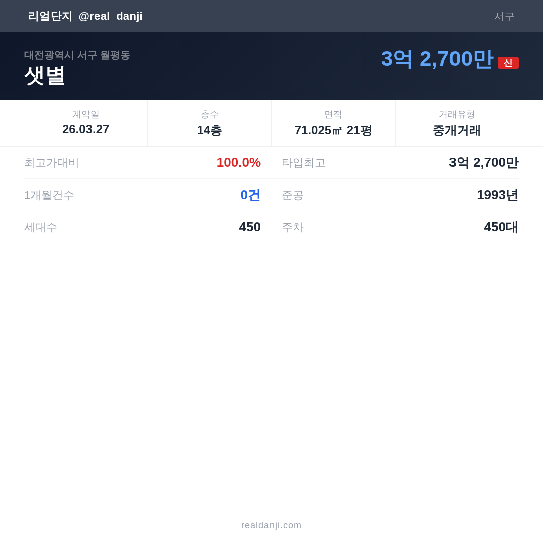 샛별 최근 거래가는 3억 2,700만입니다. (2026-03)