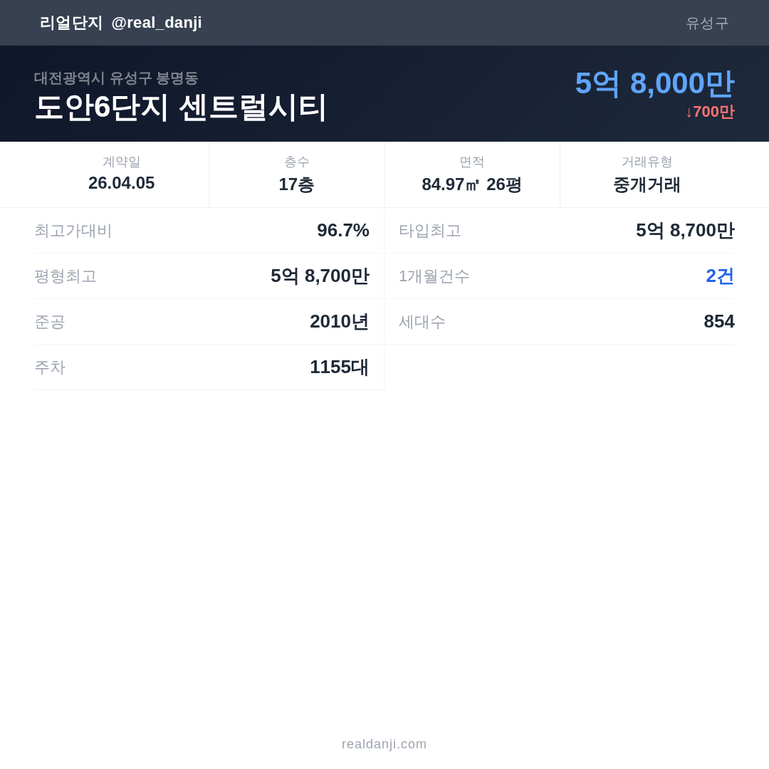 도안6단지 센트럴시티 최근 거래가는 6억입니다. (2026-04)