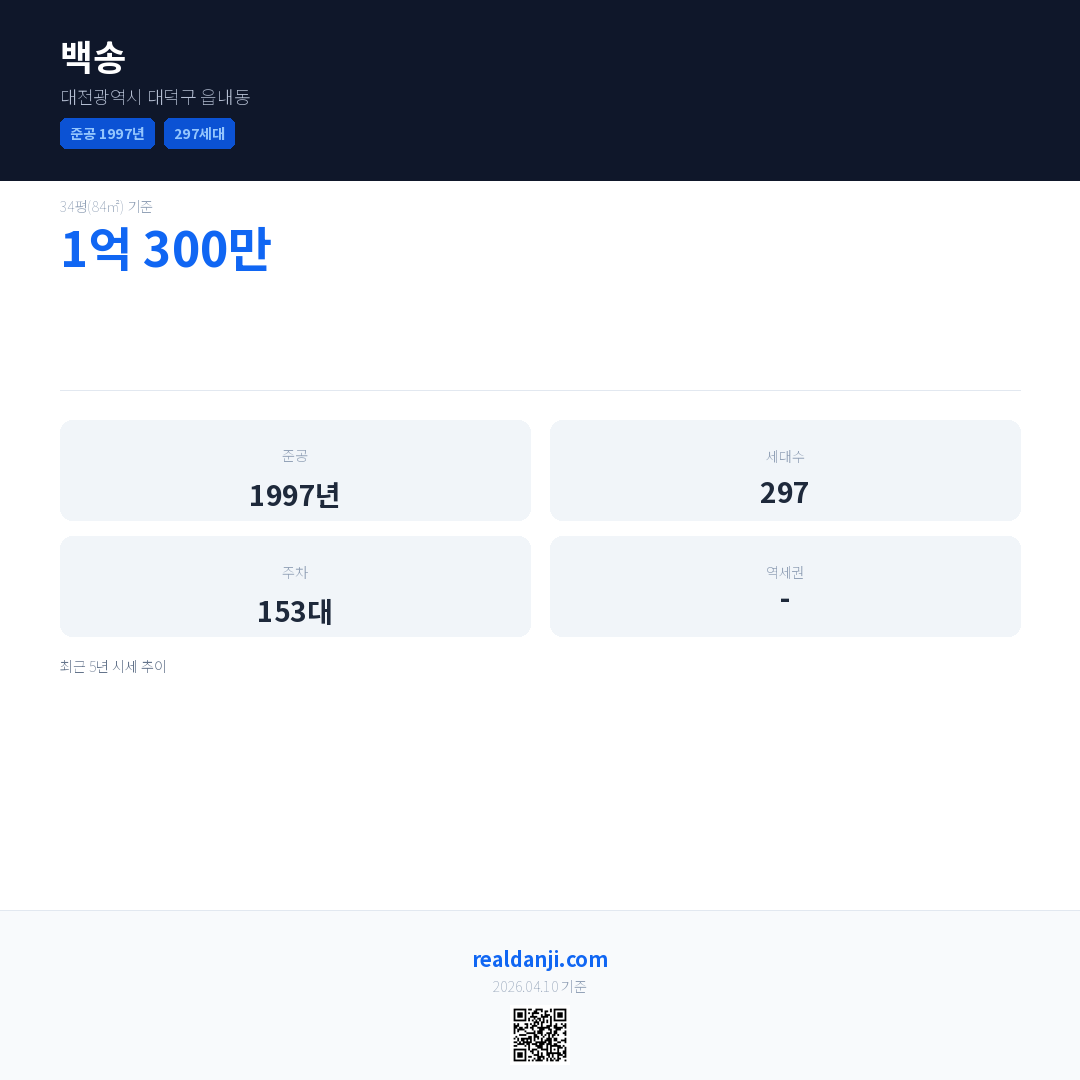 백송은(는) 1997년에 준공되었으며, 현재 29년차입니다. 총 297세대 규모입니다.