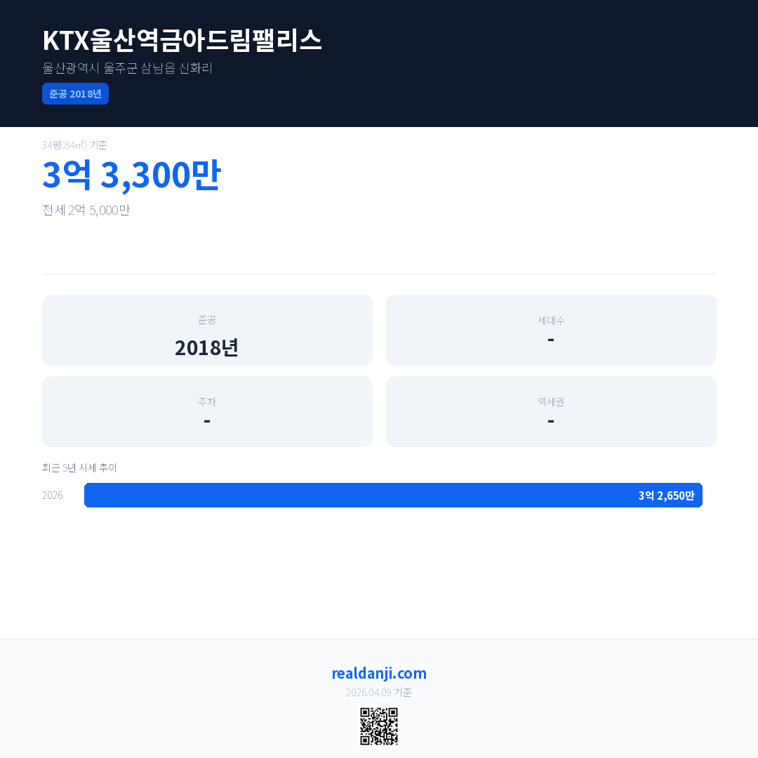 KTX울산역금아드림팰리스 최근 거래가는 3억 3,300만입니다. (2026-04)