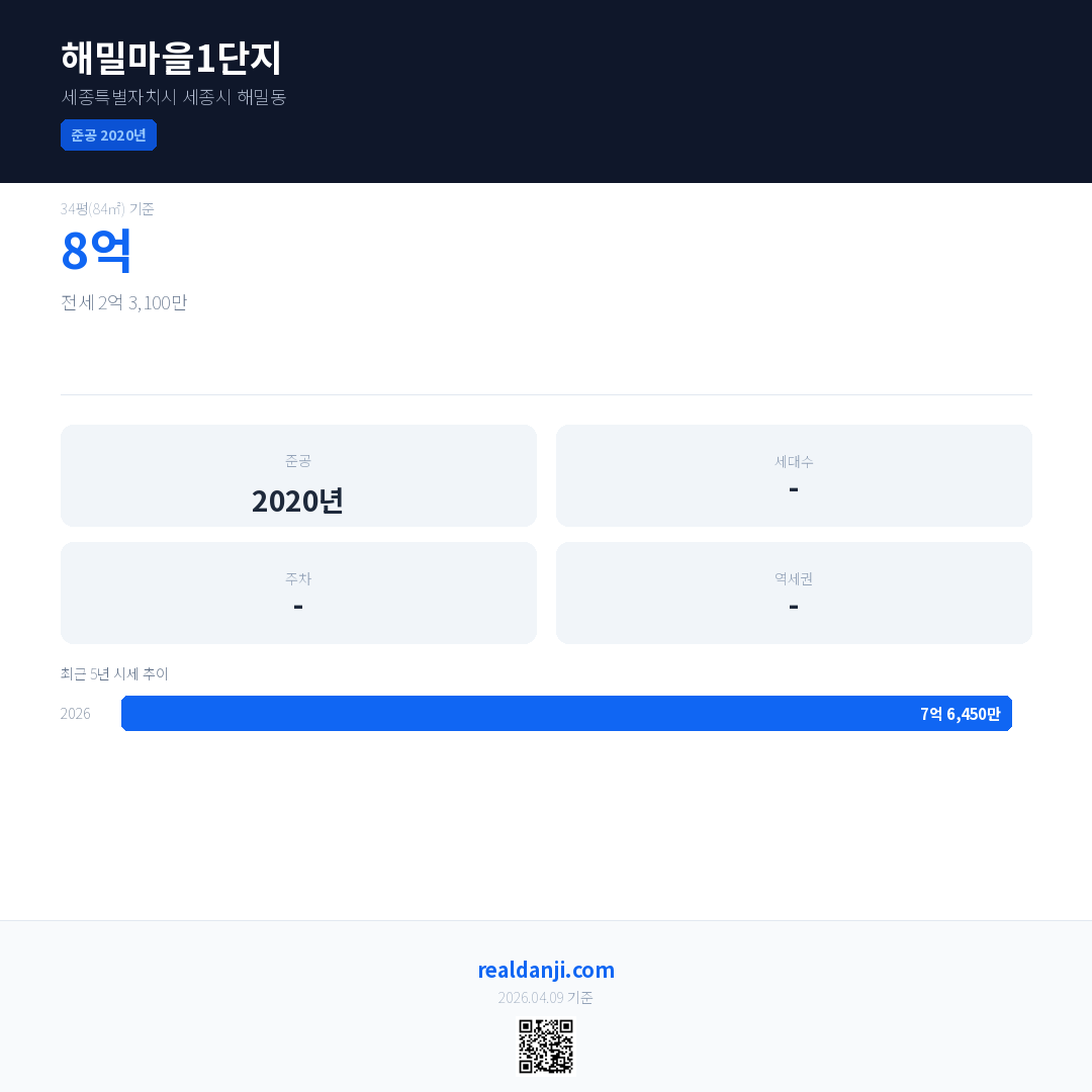 해밀마을1단지 최근 거래가는 8억입니다. (2026-03)