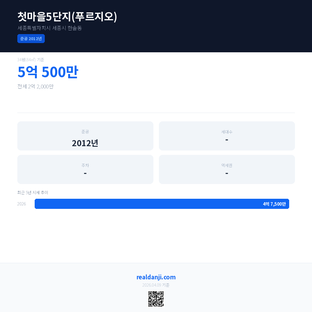 첫마을5단지(푸르지오) 최근 거래가는 5억 500만입니다. (2026-03)