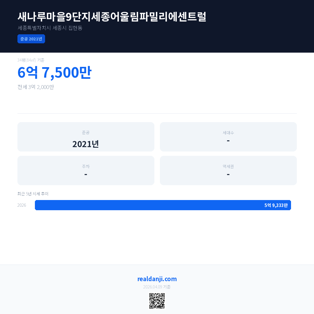 새나루마을9단지세종어울림파밀리에센트럴 최근 거래가는 6억 7,500만입니다. (2026-04)