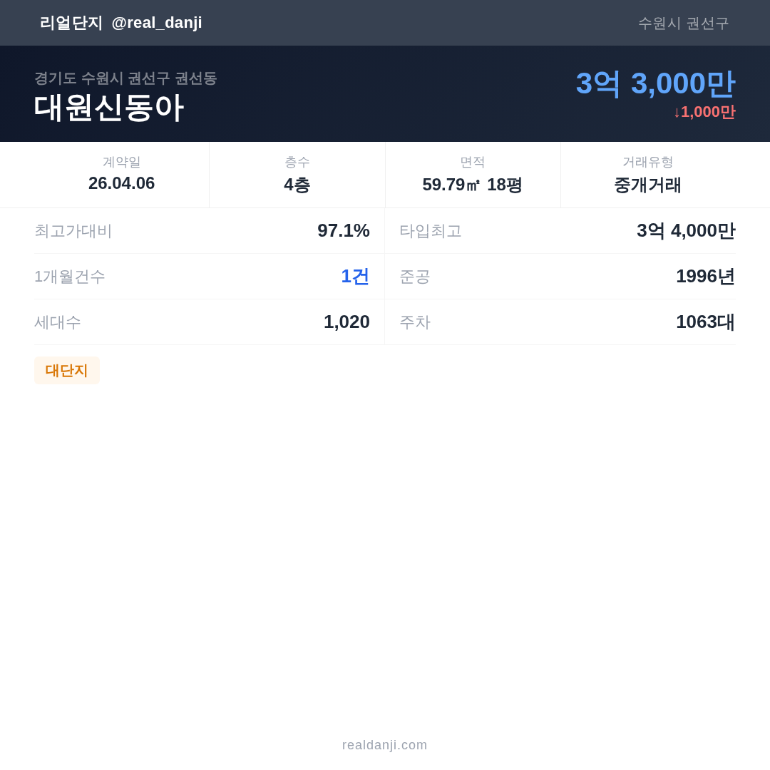 대원신동아 최근 거래가는 3억 4,000만입니다. (2026-04)