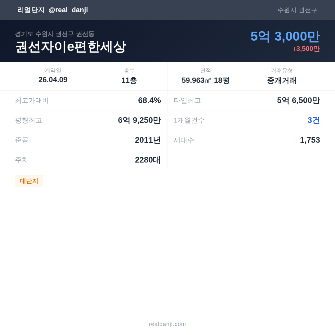 권선자이e편한세상은(는) 2011년에 준공되었으며, 현재 15년차입니다. 총 1,753세대 규모입니다.