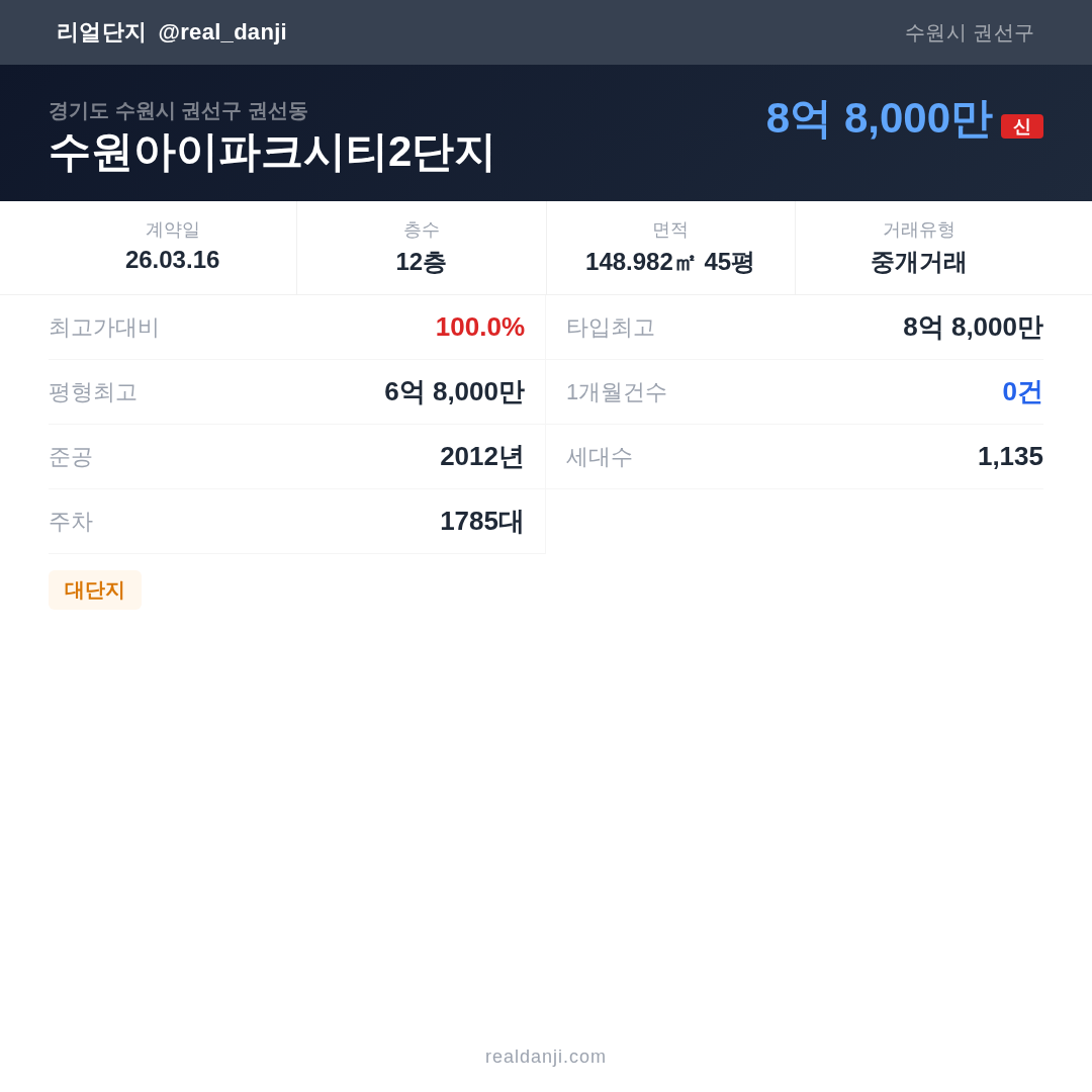 수원아이파크시티2단지 최근 거래가는 8억 8,000만입니다. (2026-03)
