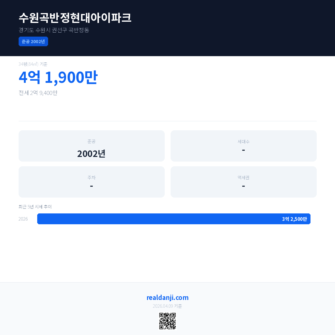 수원곡반정현대아이파크 최근 거래가는 4억 1,900만입니다. (2026-04)