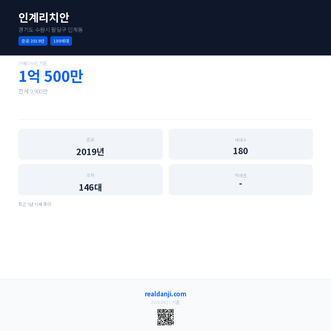 인계리치안은(는) 2019년에 준공되었으며, 현재 7년차입니다. 총 180세대 규모입니다.