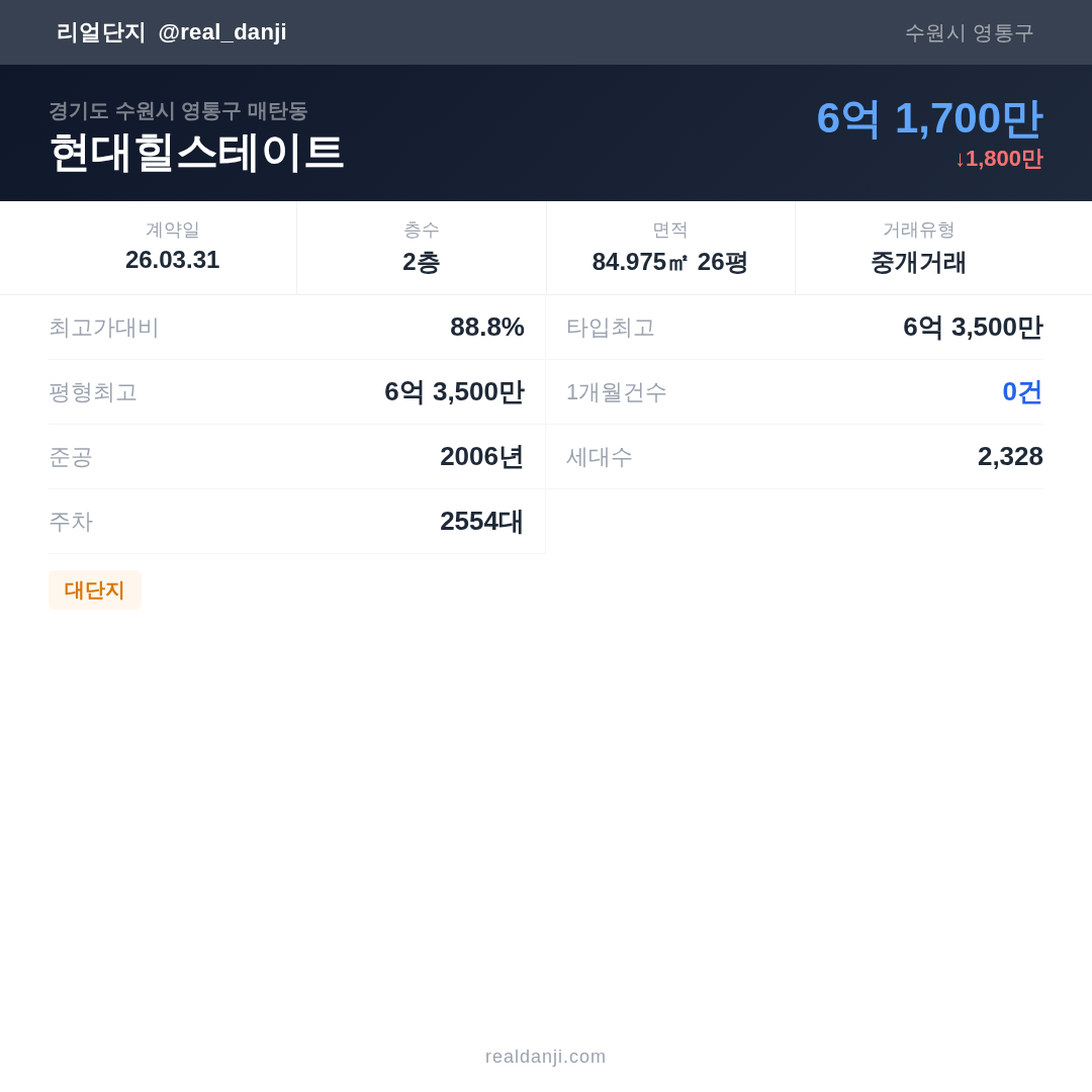 | 2026.03.31 | 85㎡ | 2층 | 6억 1,700만 |