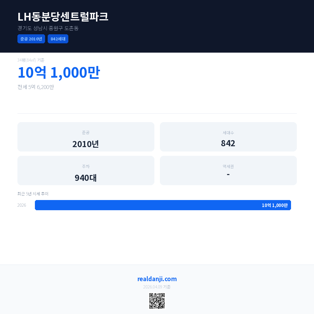 LH동분당센트럴파크 최근 거래가는 10억 1,000만입니다. (2026-03)