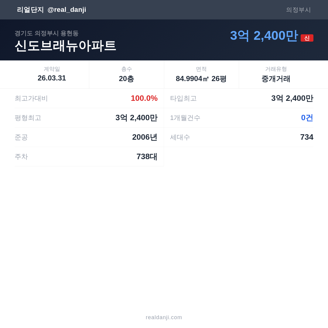 신도브래뉴아파트 최근 거래가는 3억 2,400만입니다. (2026-03)