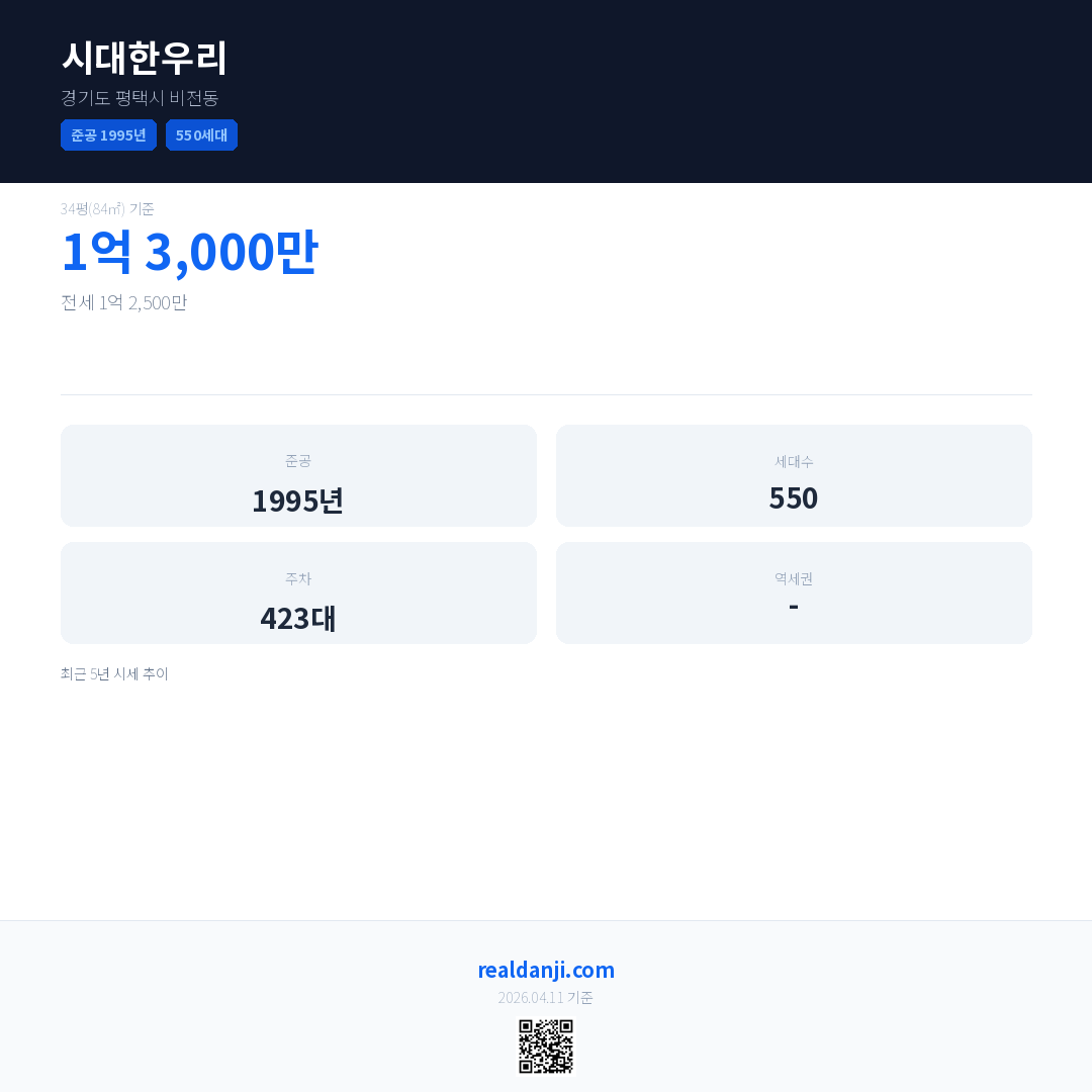 시대한우리은(는) 1995년에 준공되었으며, 현재 31년차입니다. 총 550세대 규모입니다.